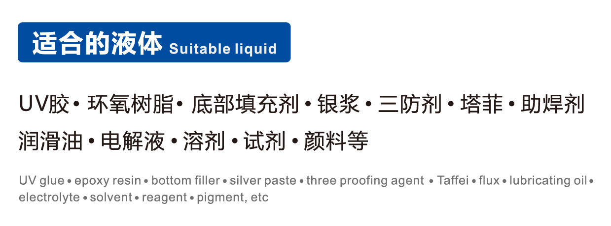 適用于FPC底部填充、補強,手機攝像頭粘合,組裝、COB圍壩、SMT底部填充、元件封裝、點錫膏、點紅膠、點黑膠、半導體封裝、元器件固定等其他電子元器件高精度點膠場合。