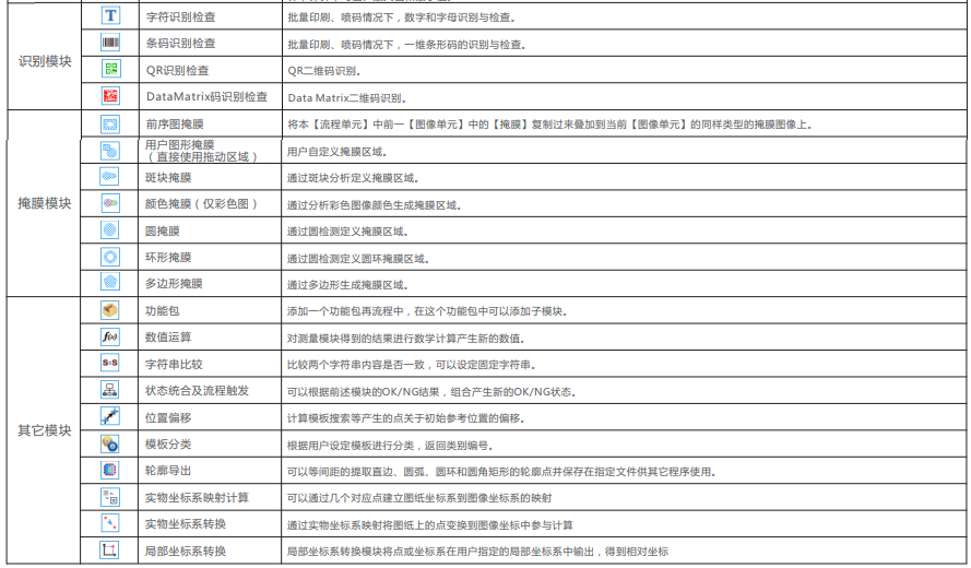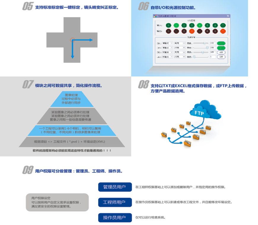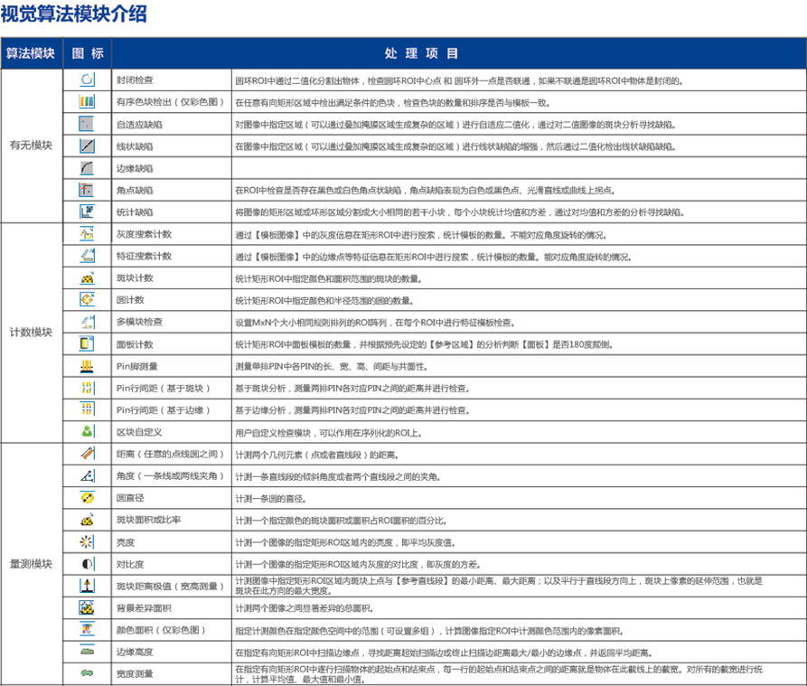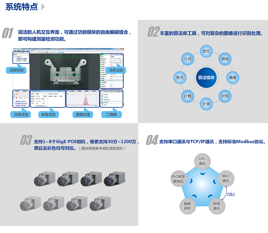 模塊化設(shè)置簡(jiǎn)單快捷,快速對(duì)應(yīng) ,我們也可以根據(jù)客戶的實(shí)際需求,進(jìn)行新模塊的定制研發(fā)及實(shí)施。系統(tǒng)設(shè)定好相機(jī)觸發(fā)模式,并采集好圖像后,按照軟件的工作流程和邏輯,可從算法庫(kù)中選擇需要的模塊對(duì)圖像進(jìn)行處理分析,然后將處理結(jié)果以網(wǎng)絡(luò)、串口或IO通訊的方式發(fā)送給客戶端及執(zhí)行機(jī)構(gòu)。