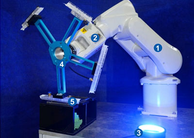 ● Using 6-axis robot with four suckers and two cameras can save two labors.